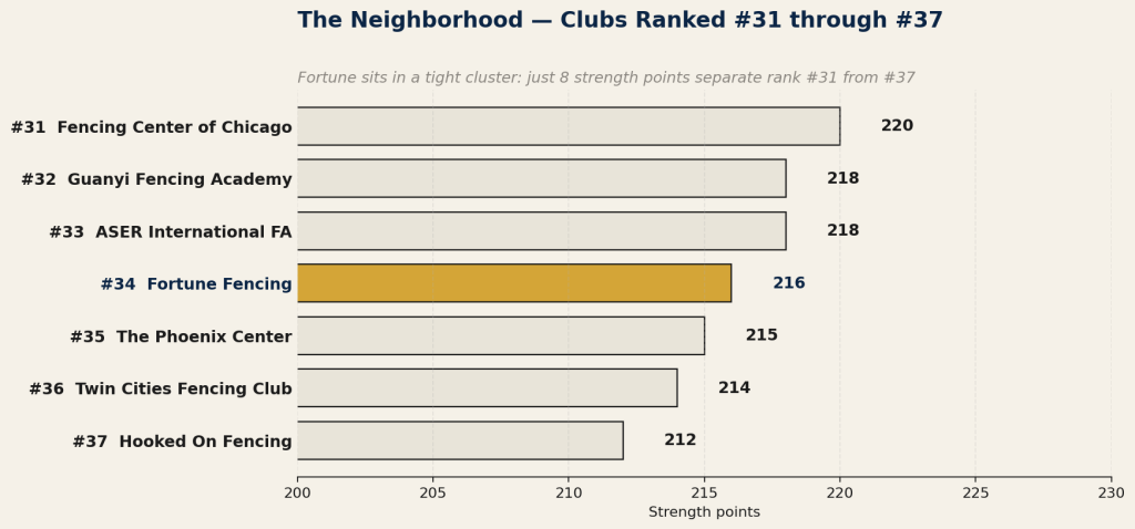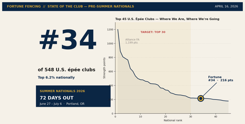 Ranked #34 of 548 U.S. épée clubs. 32 podiums. 13 new ratings. One qualification deadline on May 6, and one national championship waiting in Portland. Here’s where Fortune stands.