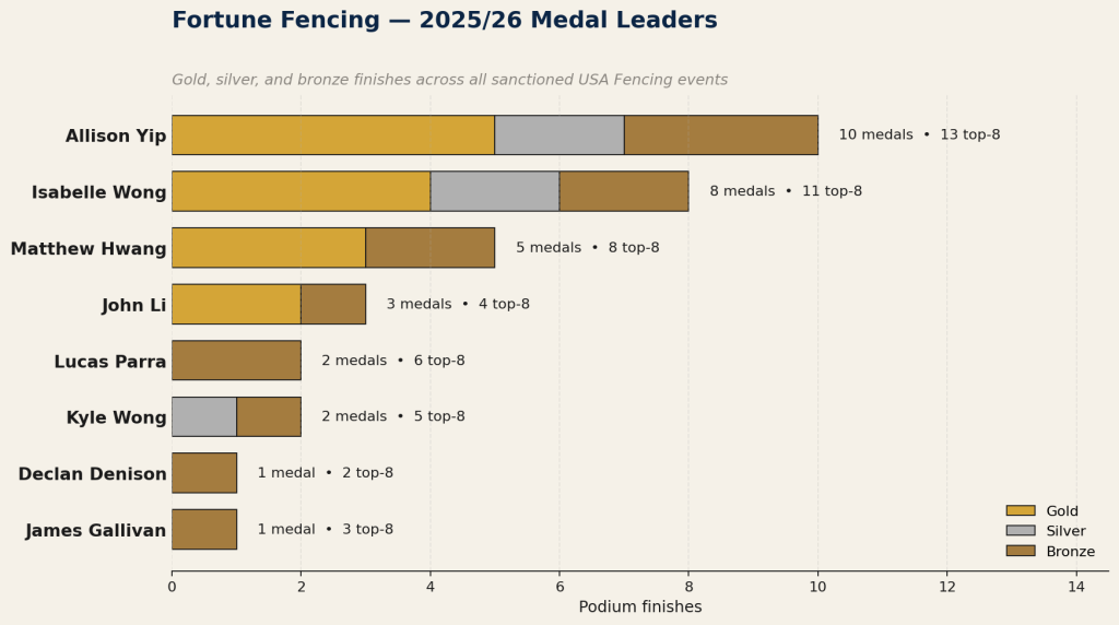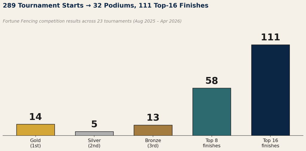 That steady month-over-month production is not an accident. It’s the signature of a program with a training floor, not just a ceiling. Fortune fencers show up every weekend expecting to place; that expectation is what separates clubs that briefly spike from clubs that climb and hold.