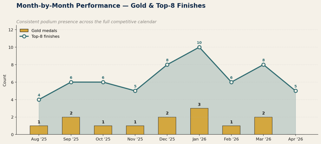 Gold medals and top-8 finishes by month, 2025/26 season