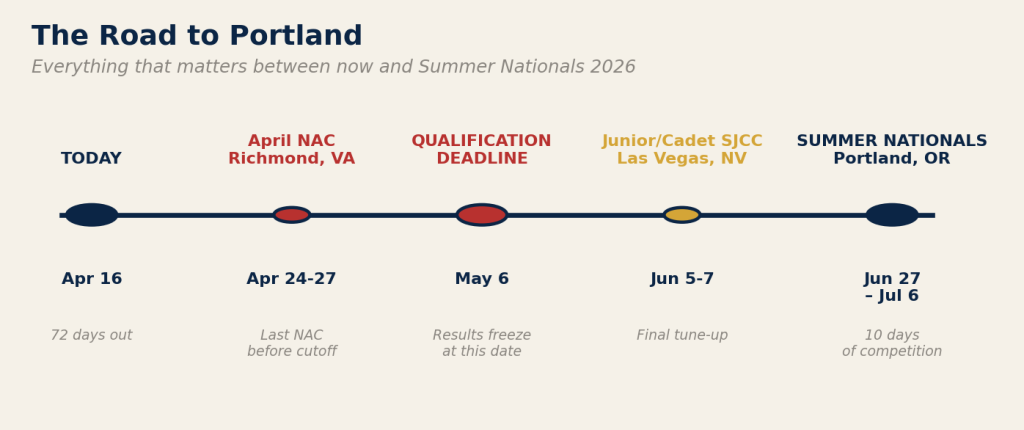 It is April 16, 2026. Summer Nationals begin in 72 days at the Oregon Convention Center in Portland. The qualification deadline — the moment when every regional and national point standing freezes and USA Fencing draws its lines — is May 6, 2026. That’s 20 days from today.