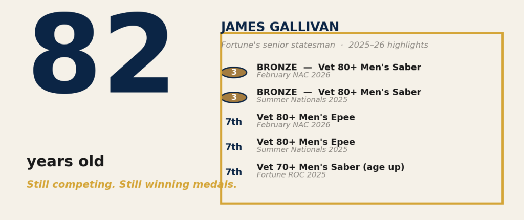 If Allison Yip is the story of Fortune’s present, James Gallivan is the story of what Fortune is. At 82 years old, he is competing at the highest national level in saber and epee in the Vet 80+ age category — and he is winning medals doing it.
